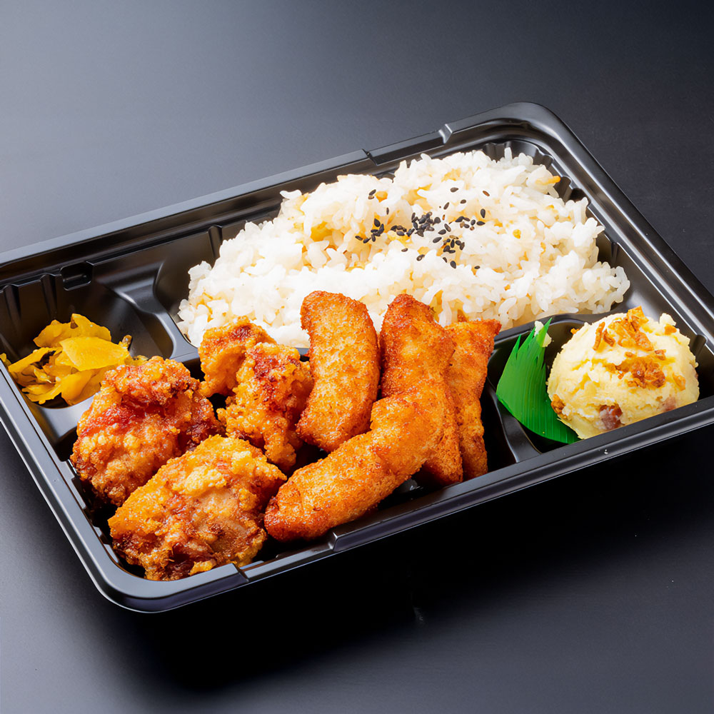 だしで炊いたご飯と燻製醤油でつけた唐揚げは絶品!マシマシはももから揚げ1個とむねスティック4本とご飯大盛りがお弁当にプラスされます。